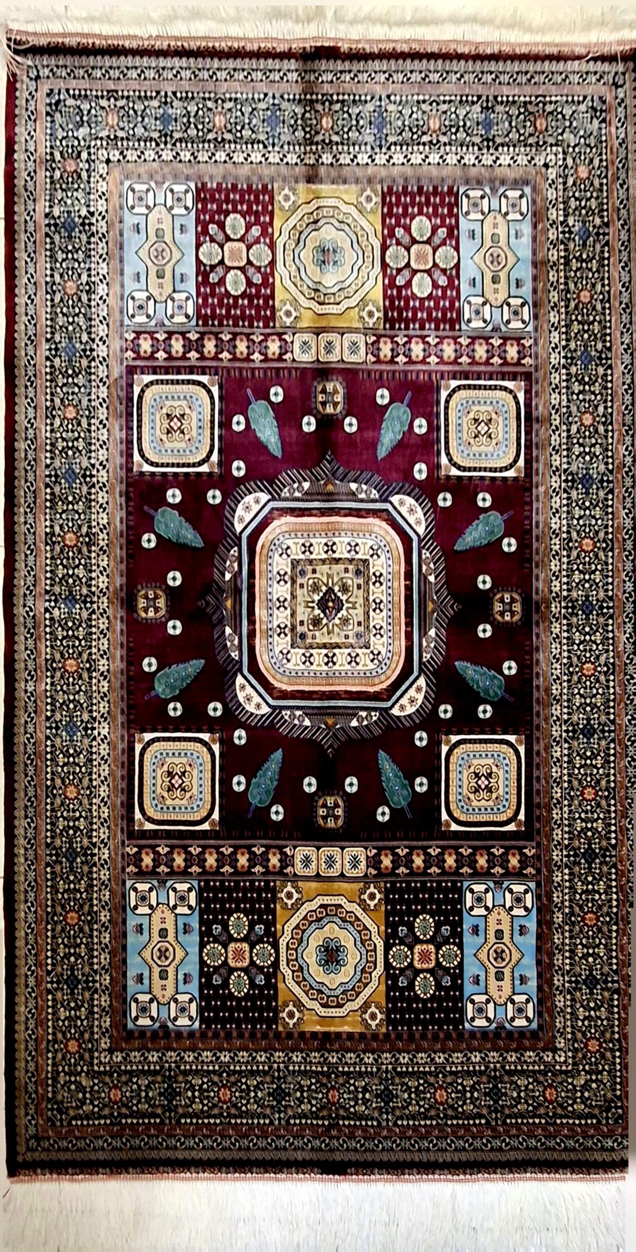 - Motifs: Octagonal central medallion, “Boteh” (leaf/teardrop) accents, geometric rosettes, and floral scrolls.